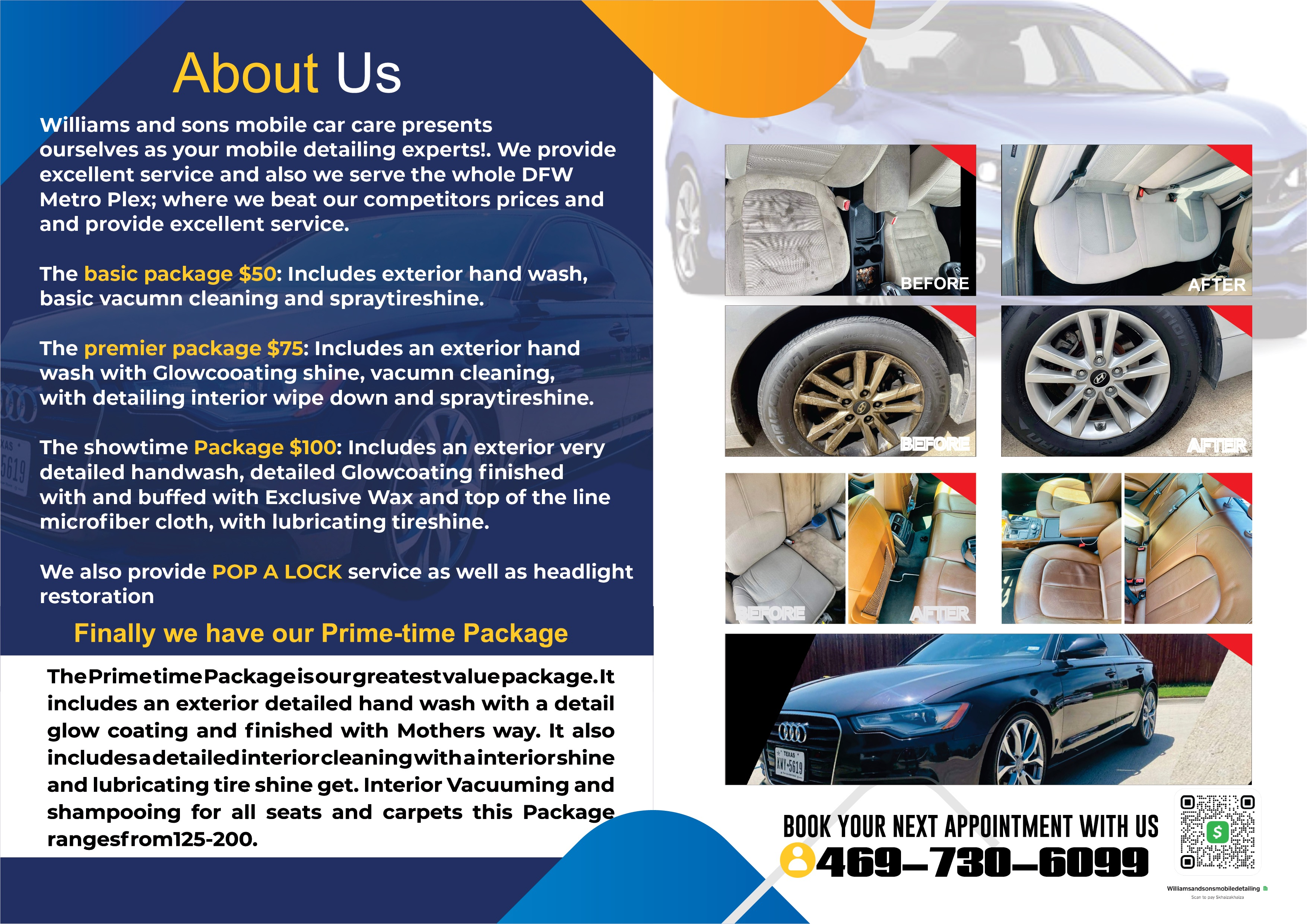 Includes an exterior hand wash with Glowcooating shine, vacuum cleaning, with detailing interior wipe down and spray tire shine .